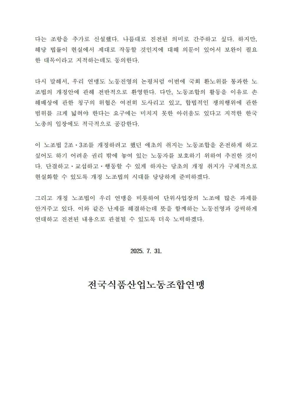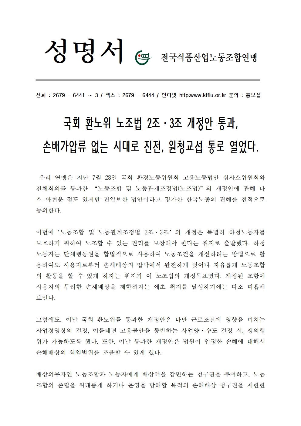 [성명서] 국회 환노위 노조법 2조·3조 개정안 통과, 손배가압류 없는 시대로 진전, 원청교섭 통로 열었다.