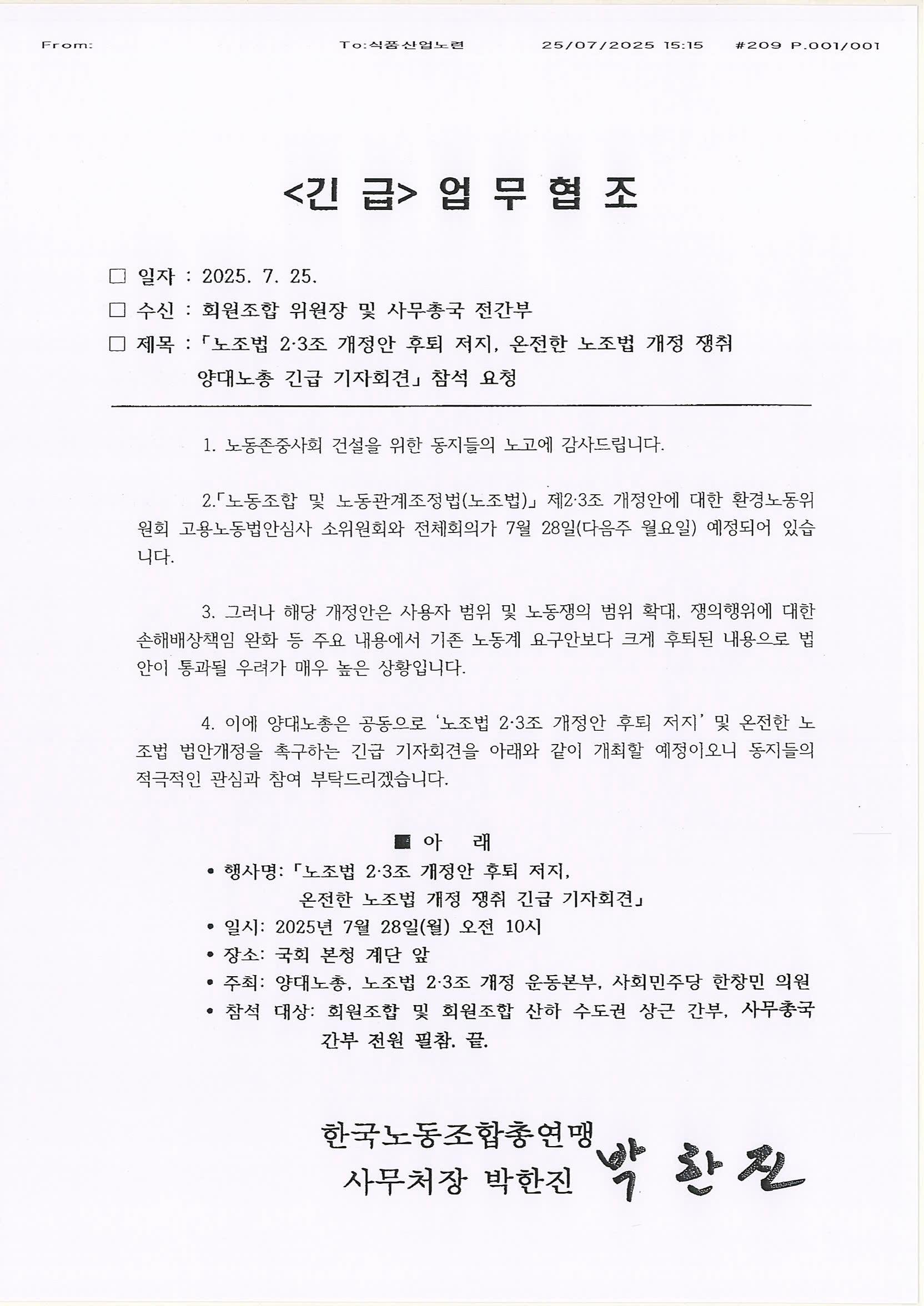 「노조법 2·3조 개정안 후퇴 저지 , 온전한 노조법 개정 쟁취 양대노총 긴급 기자회견」 참석 요청