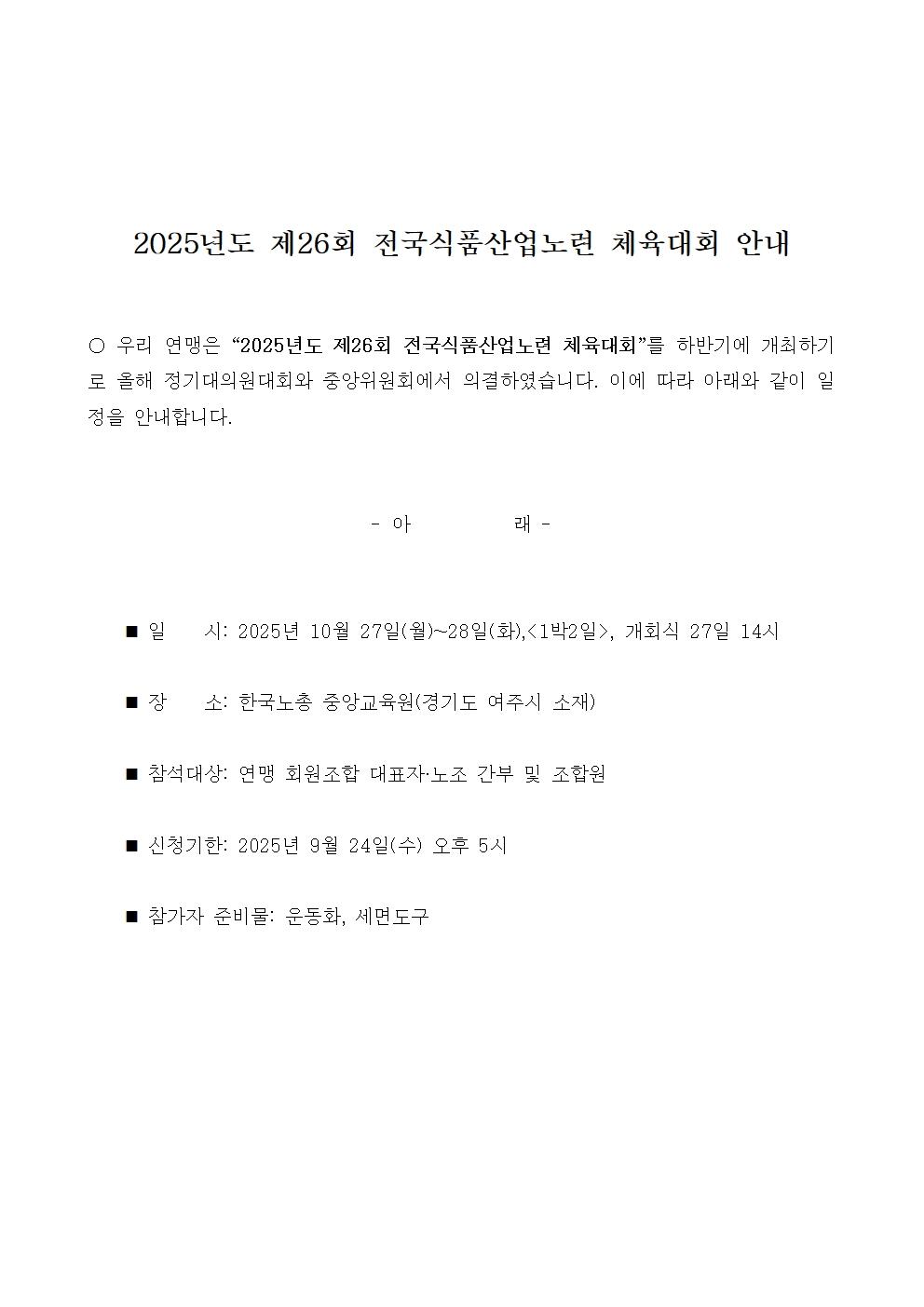 제26회 전국식품산업노련 체육대회 안내
