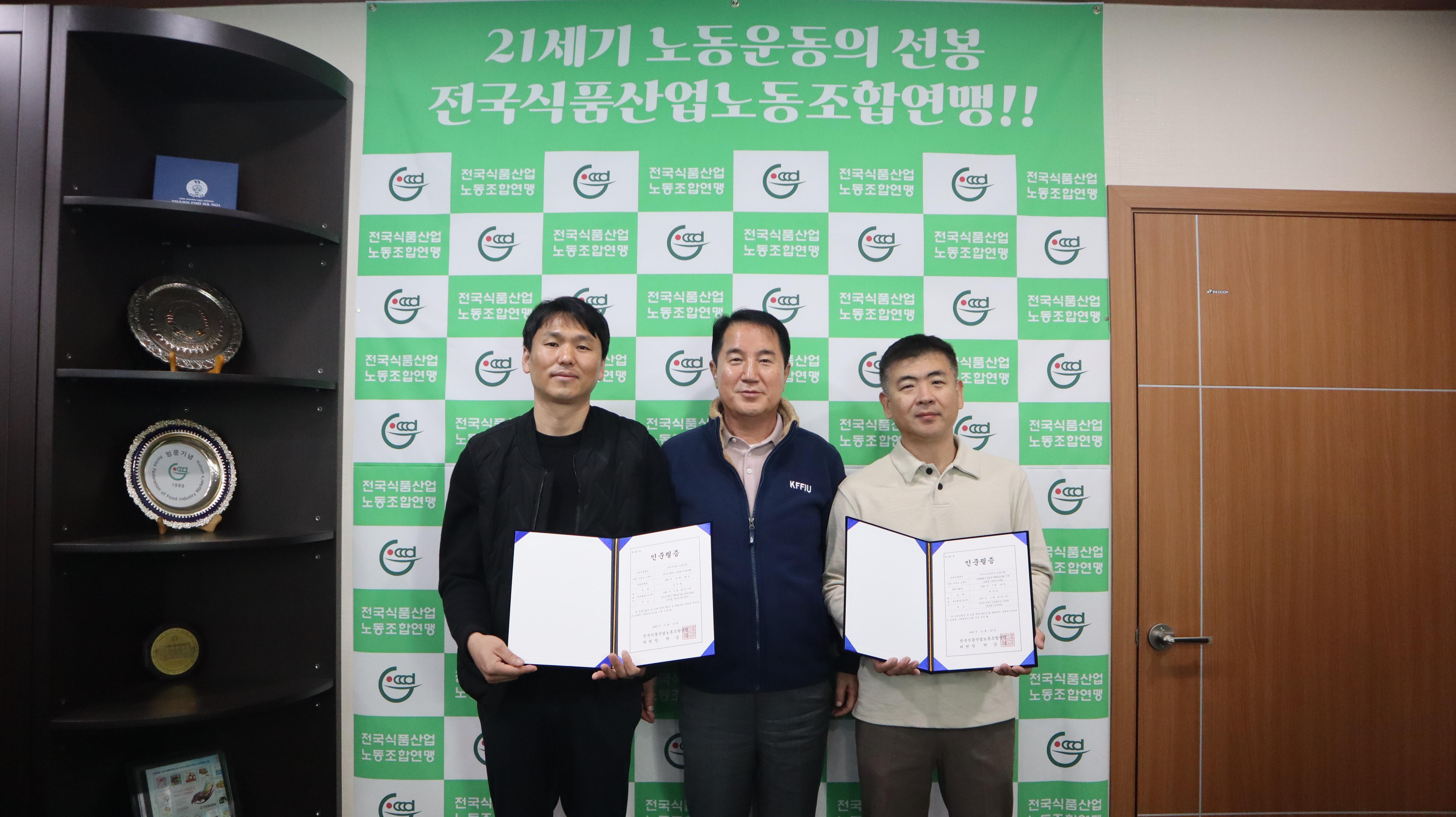 오뚜기라면노동조합과 디아지오코리아노동조합은 11월 12일(수) 우리 연맹을 방문하여 신임 및 신규조직 위원장의 자격으로 인준증을 받았다.박갑용 연맹위원장은 권순천 디아지오...